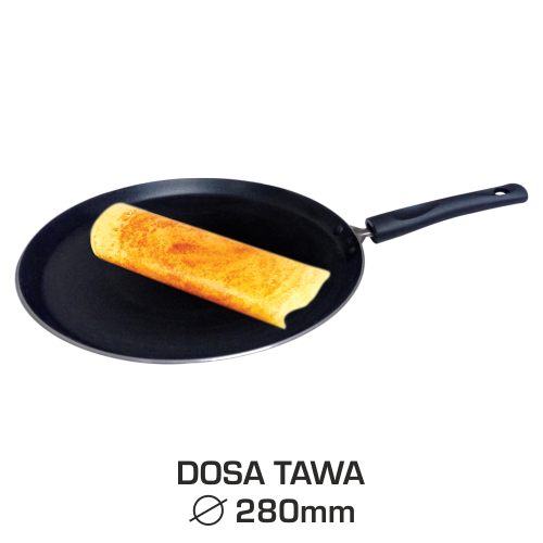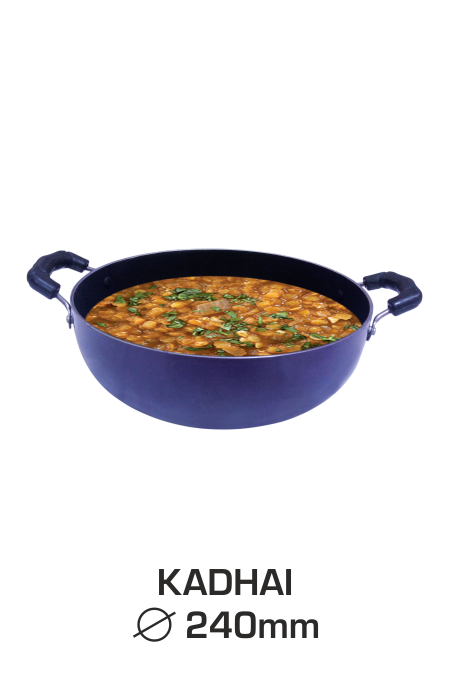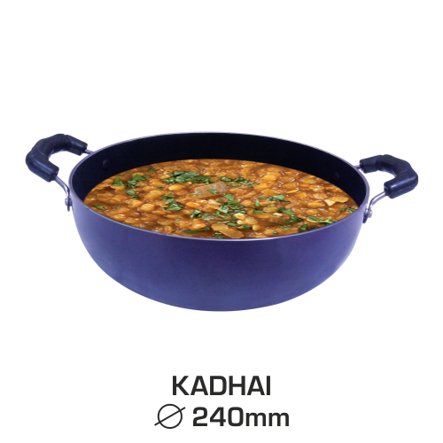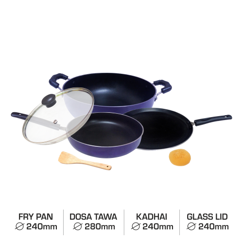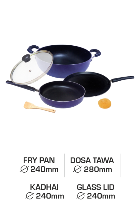 Contents of package : 1 piece Dosa Tawa (280 mm), 1 piece Fry Pan (240 mm), 1 piece Kadai (240 mm / 2.5 Ltrs), 1 piece Glass Lid (240 mm)