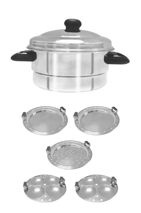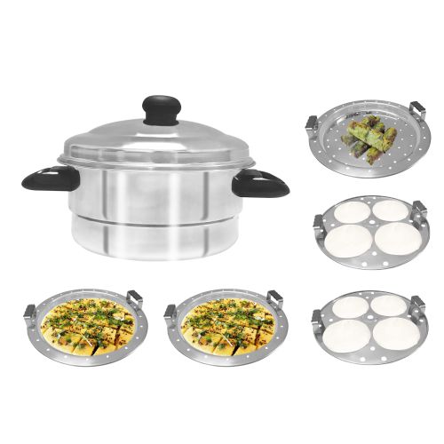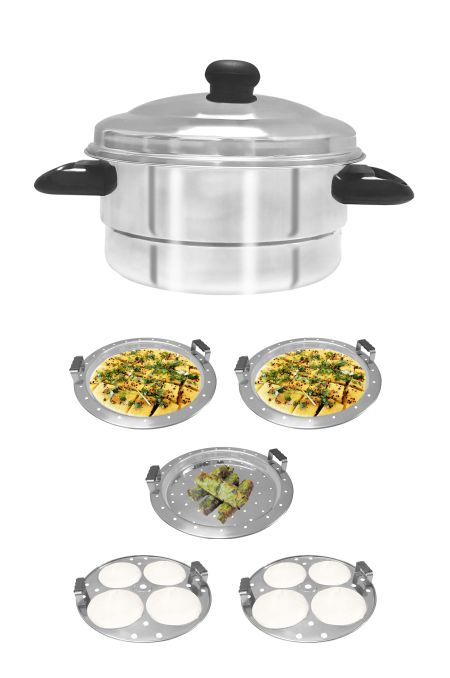 Multi-purpose cook n serve set. Cooks Idlis, Dhoklas, Patras & various other dishes Professionally manufactured using High Quality & Heavy Gauge St. Steel Riveted Long lasting Stay Cool Handles Material: Stainless Steel Package Contents: 1 Pc idli cooke and 2 Idli Plates + 2 Dhokla + 1 Patra Plate Springway Stainless steel Multi Idli cooker, made of high quality stainless steel, its very sturdy and is made up of thick gauze and Scratch Resistant and its very easy to clean, this can be used
