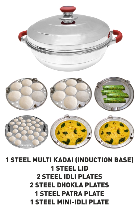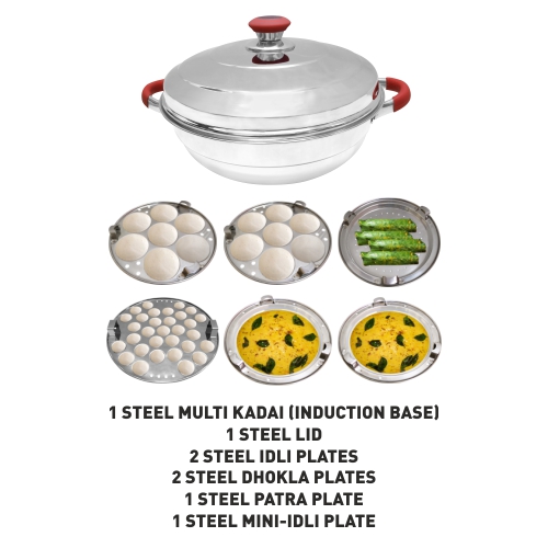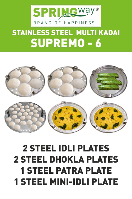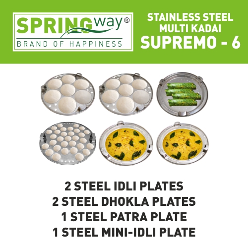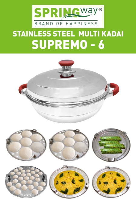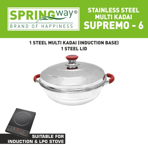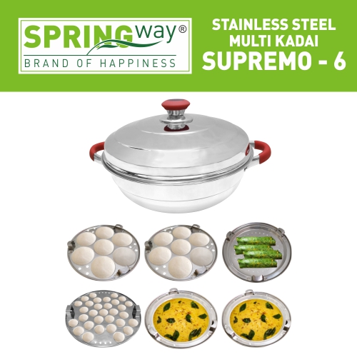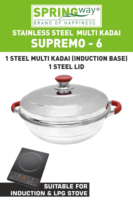 Springway multi-purpose cook n serve Kadai which also can be utilized to feed assorted family demands like Idlis, Dhoklas, Mini Pancakes etc.Its ergonomically designed handle gives a firm grip & ease of lifting.The stainless steel lid is provided for steam cooking.The Kadai comes with a Induction base that ensures uniform and quick heating that saves your time in the kitchen.A unique gifting solution for every occasion